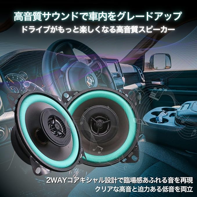 ✅【4インチで高音質】4インチ(10cm)2WAYコアキシャル設計のスピーカーが、車内音響をワンランク上へ。純正スピーカーからの交換に最適。