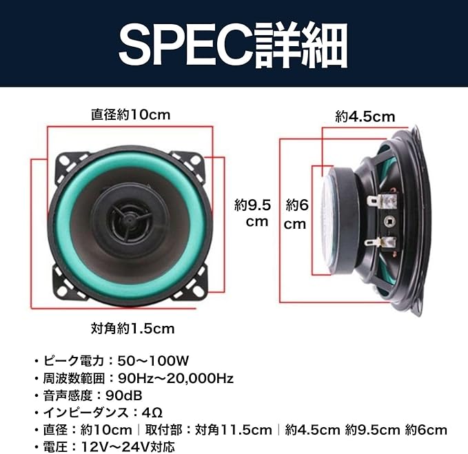 ✅【商品内容】スピーカー2個セット/出力:50W(定格)、100W(最大)/インピーダンス:4Ω/対応電圧:12V~24V