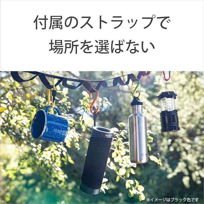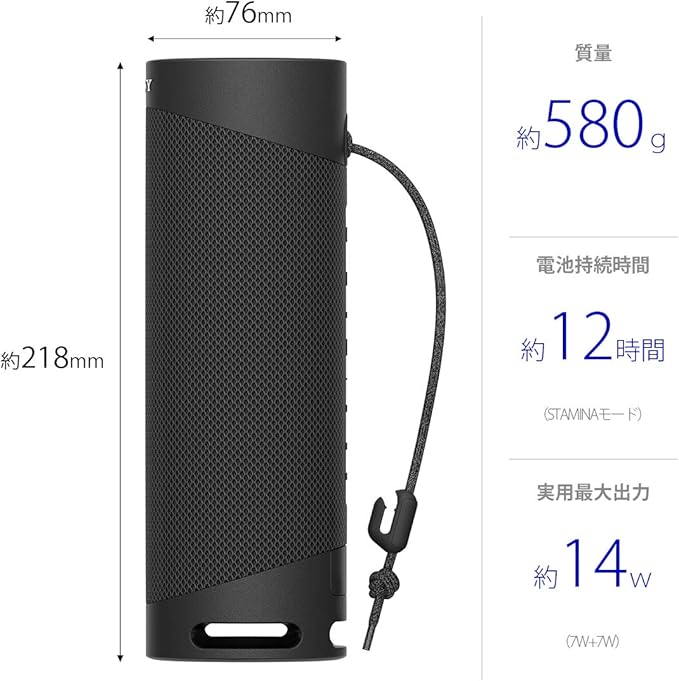 ■持ち運んでも安心して使えるロングバッテリー:4時間の充電でSTAMINAモード時には12時間再生(*1)、EXTRABASSモード時には10時間再生(*2)ができるバッテリーを内蔵。リビング、キッチン、お風呂はもちろん、ビーチやキャンプ、バーベキューなどに持ち運んでも、バッテリーを気にせず長時間使用できます。*1 サウンドモードがSTAMINAモード、音量は約半分で使用の場合。工場出荷時の設定からサウンドモードを切り替える必要があります。切り替え方法は、取扱説明書やヘルプガイドでご確認ください。音量や再生楽曲、周囲の温度など使用状況により、記載の時間と異なる場合があります
