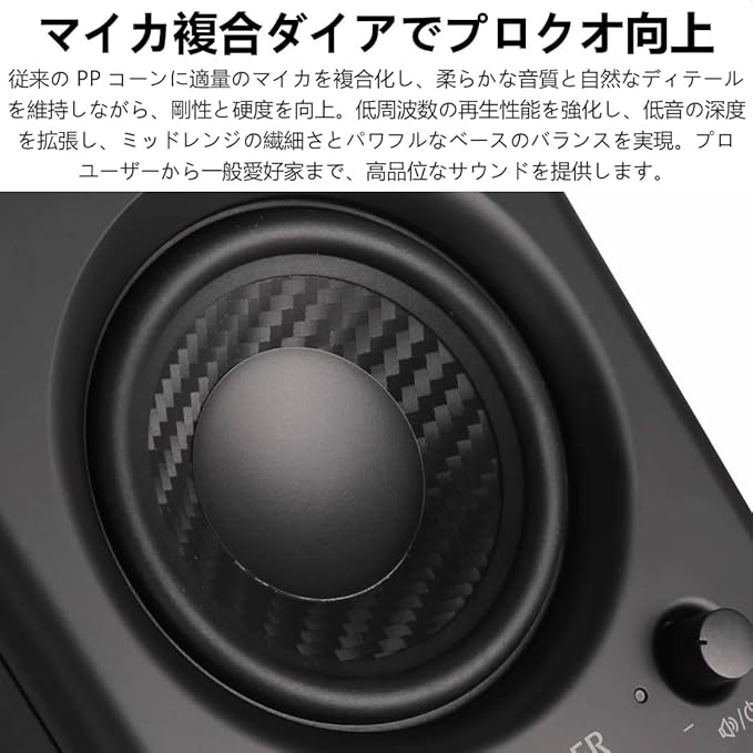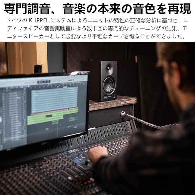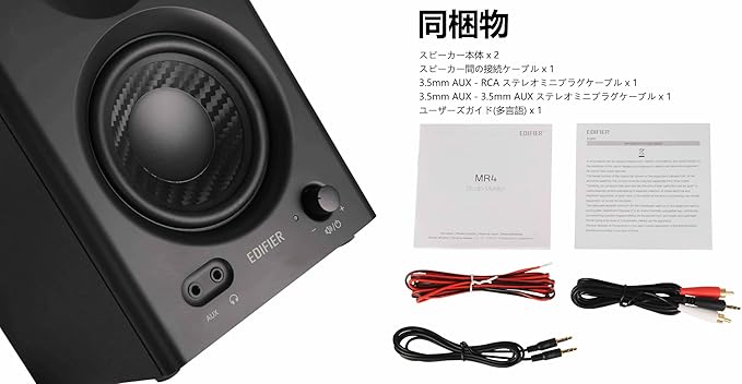 Edifier MR4 42W モニタースピーカー、4インチ中低音 音質高、PC dtm 作曲 スタジオモニター用有線外付け、TRSバランス/RCA/AUX入力、3.5mm ヘッドホン端子出力、アンプ内蔵 2台1組 黒