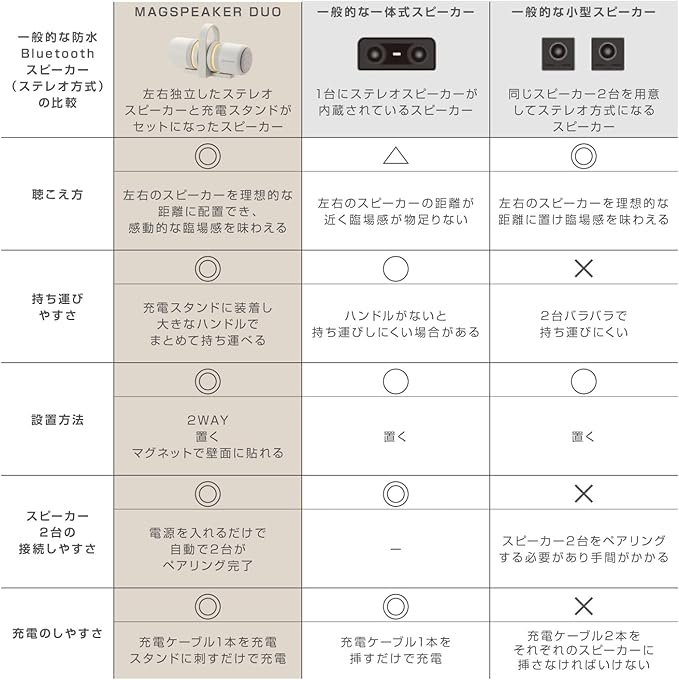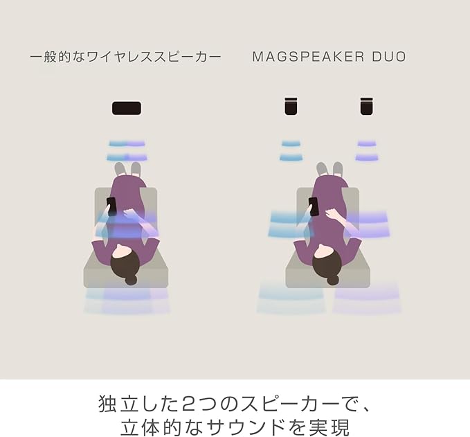 【2つのスピーカーだからできる立体的なサウンド】一般的に「1台」で販売されているワイヤレススピーカーと違い、MAGSPEAKER DUOは「独立した2つのワイヤレススピーカー」を搭載。両耳が左右に届いた音の違いを感じ取り、シネマサウンドやアーティストのボーカル、楽器がその場にあるような臨場感のある空間を作り出します。