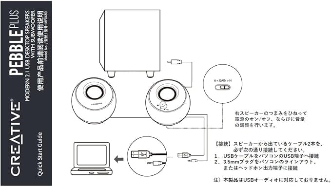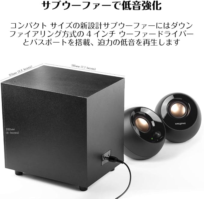 【サブウーファー付 3.5mmプラグケーブルモデル】PCのUSBポートや市販のUSB電源アダプターで給電が可能で、音声は手軽な3.5mmプラグケーブルを接続するだけの大人気、Creative Pebble譲りのデザインにコンパクトサイズでダウンファイアリングサブウーファーを追加したUSB給電コンパクト2.1chスピーカー