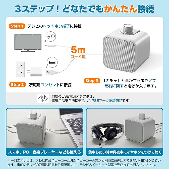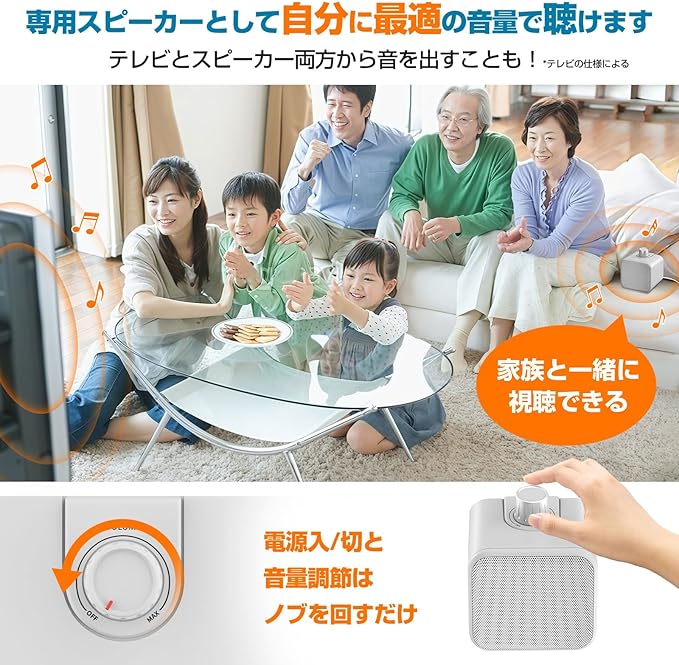 【安定の有線接続!音ズレが少ない】有線接続のため電波干渉による音声遅延と音途切れなどを抑え、テレビ本体スピーカーと同時に音を出しても音ズレの違和感が少ないです。ケーブルの長さは5mで、部屋を自由に移動して設置可能です。 【1分で設置完了!どなたでも簡単に接続】ケーブルを繋ぐだけ!テレビのヘッドホン端子に接続して、USB端子から給電するだけのかんたん接続。操作もボリュームノブを回すだけのかんたんでシンプルな設計です。電源入/切と音量調節がひとつのダイヤルでできます! 【届いてからすぐに使える】接続に必要なケーブルや電源アダプタがすべて付属しております。買ったその日からすぐに使えます。USB給電式を採用したので通電するとすぐに使えます!充電式と比べると数時間ごとに充電する手間がかからなくて楽です。また、市販の電源アダプタとの相性問題でノイズや雑音が発生しやすいため、本品は専用の電源アダプタを付属しました!
