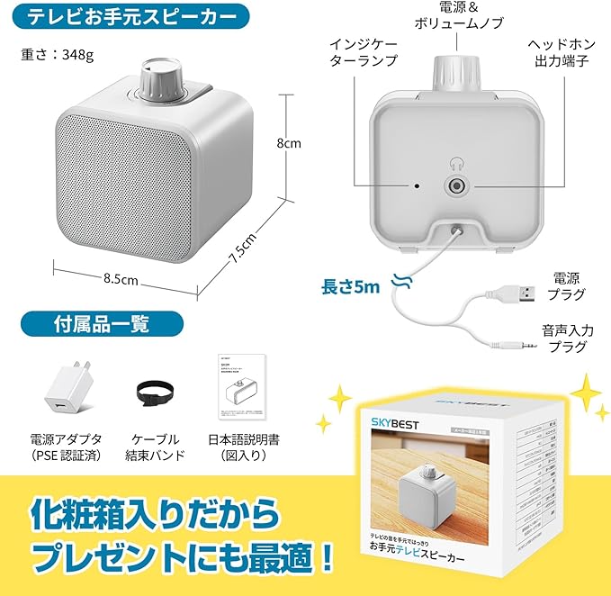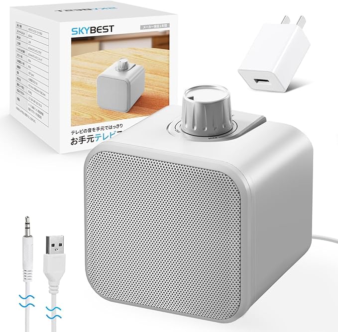 【テレビの音が聞こえるスピーカー】テレビの音を近くで聞ける!お手元に置いたスピーカーからテレビの音を流すことができるので音量を上げ過ぎずに視聴が可能です。 【はっきり音声!高齢者向けに音質強化】ニュースやドラマのセリフなど、人の声がこもってはっきり聞き取れない場合は音量を上がると背景音楽や効果音も一緒にうるさくなってしまう経験があるでしょうか?Skybest 有線スピーカーでは「はっきり音声」が搭載し、難聴の方も聞き取りやすくなるように音質を強化しました。 【最大2.5W出力】小さい筐体でも高音質&臨場感豊かなテレビ音声をお楽しみいただけるテレビ用スピーカーです。