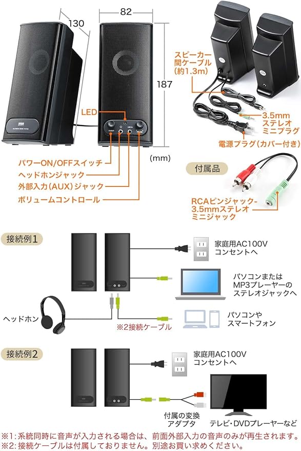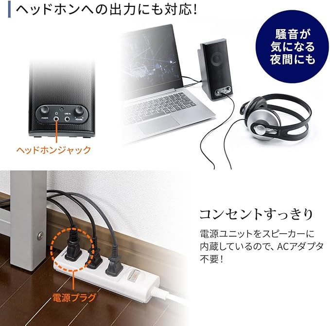 スピーカーの電源がOFFの状態でもヘッドホンからは音が出力されるバイパス構造になっています。●ACアダプタが不要な電源内蔵タイプなので、コネクタがスリムですっきりと配線ができます。●テレビの近くに置いても影響が出ない防磁型です。