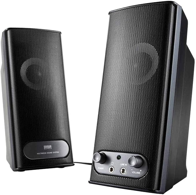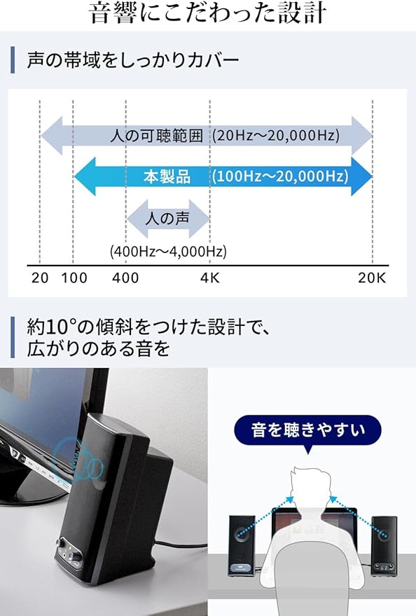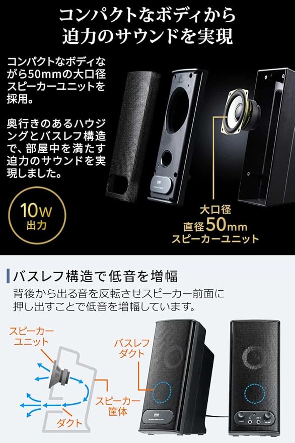 50mmの大口径スピーカーユニットを採用し、奥行きのあるハウジングとバスレフ構造で広がりのある音を再現できる2ch パソコンスピーカー です。 スピーカー の角度がやや上向きなるよう設計しているので、音が広がりやすくなっています。