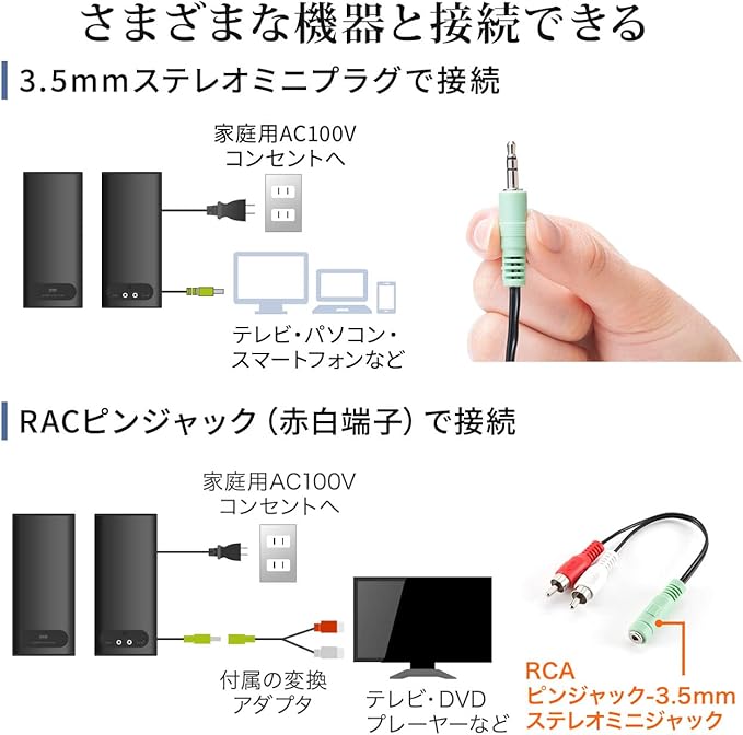 3.5mmステレオミニジャックをRCAプラグ(赤白)に変換するテレビ用変換アダプタを同梱しており、液晶 テレビ やAV機器との接続にも対応しています。