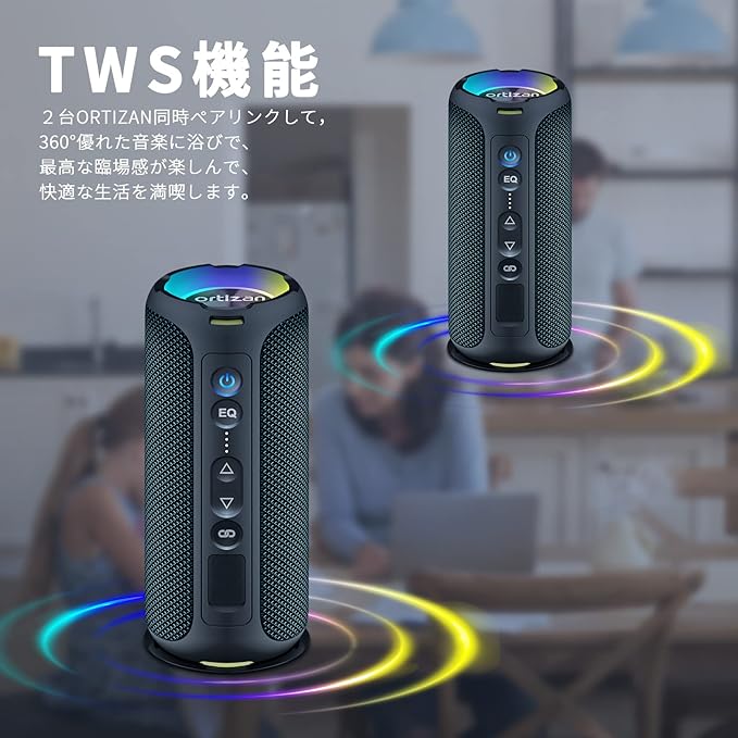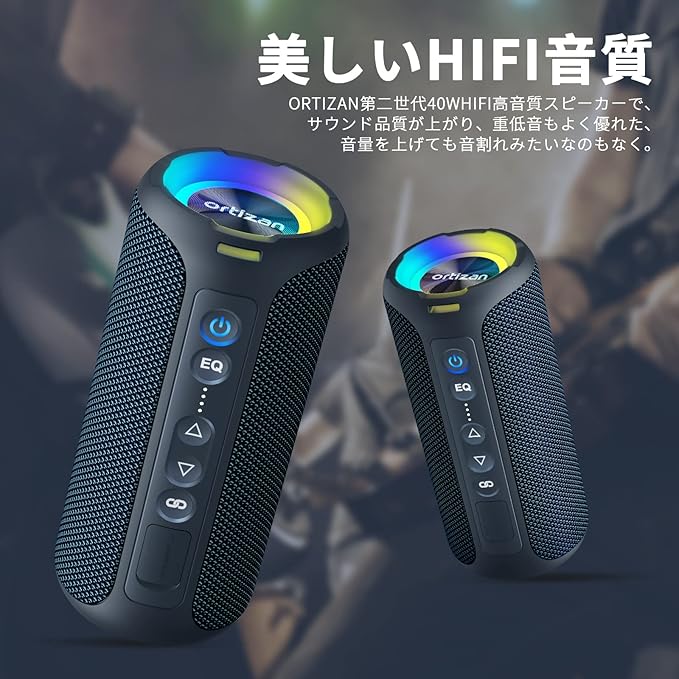 【Hi-Fi高音質&2台ペアリング機能】Ortizan第二世代40W(2x20W方側スピーカー組む合わせ)HIFI高音質スピーカーで、サウンド品質が上がり、重低音もよく優れた、音量を上げても音割れみたいなのもなく。部屋・浴室などの室内場所に使いのは大満足です。アウトドア・車・パーティーなど室外使用しでも便利です。さらに、TWS機能も対応しております。2台ワイヤレス音楽スピーカーがペアリンクして、快適に音楽が360 周りに流れます。(ペアリング方法は詳細ページにご確認ください。型番が間違うの場合はペアリングできません。)