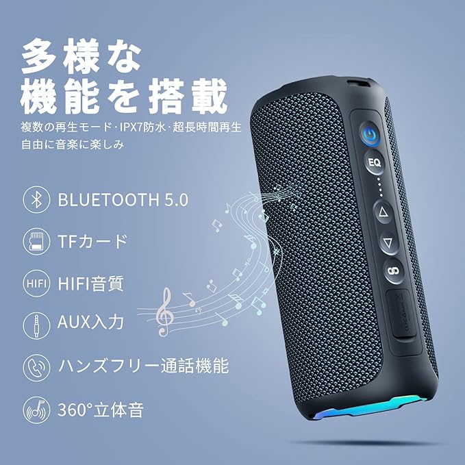 【Bluetooth5.0・ハンズフリー通話】このワイヤレススピーカーはbluetooth5.0を搭載しで、 20m くらいの距離も接続が スムーズ です。 お風呂場に置いてスマホから音楽や朗読を楽しんでいます。ブルートゥースで接続のとき、ハンズフリー通話が利用できます。お携帯が隣にいなくしでもこのマイクスピーカーを使用し、クリアな音質で音声通話を楽しめます。Bluetoothの他に、SDカードやAUX入力にも対応しています。