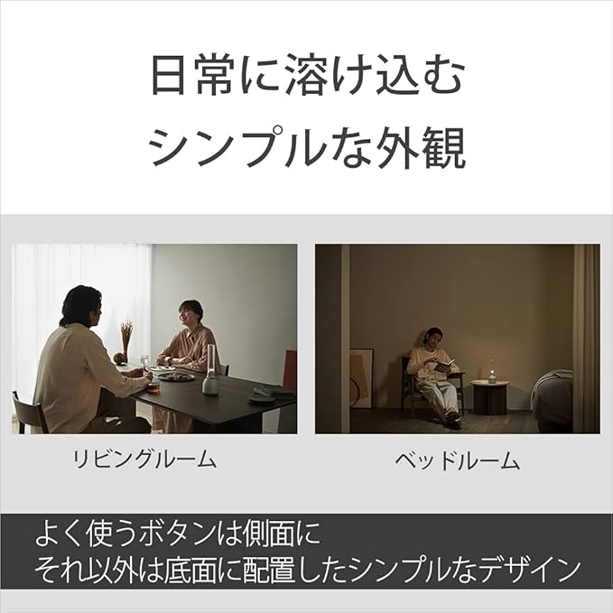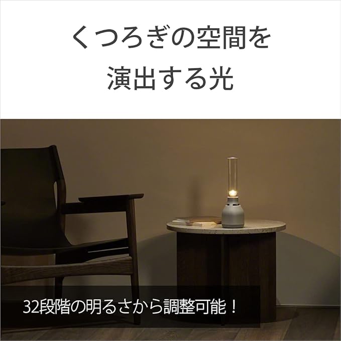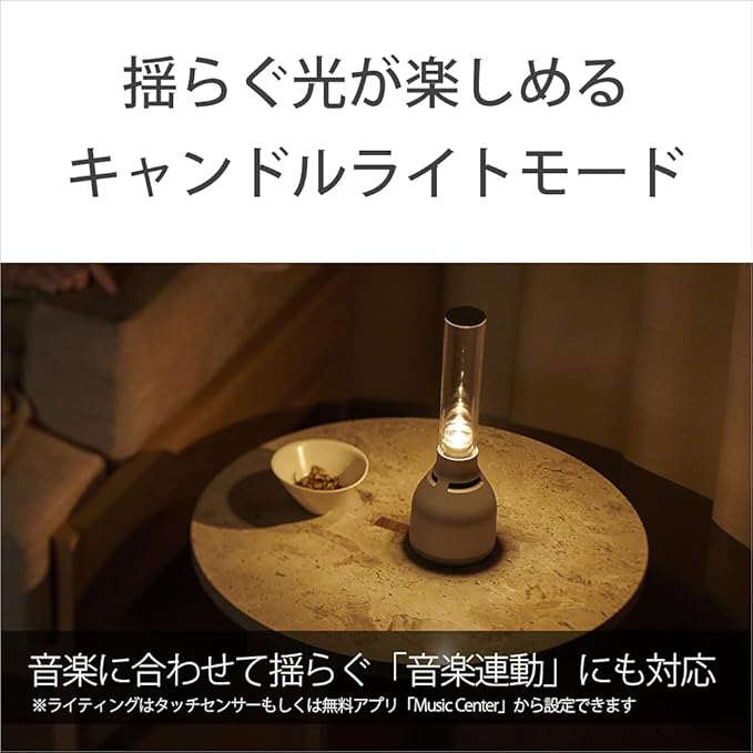 ・32段階の明るさから選べるライティング LEDの明るさは、32段階の明るさから部屋の雰囲気やお好みに合わせて調整が可能。 本体のタッチセンサーでもライティングのオン/オフの切り替えや輝度の調整が可能 キャンドルのように揺らぐ「キャンドルライト」モードも搭載。 LSPX-S2で好評だった「キャンドルライト」モードにバリエーションが増加。強中弱に加え、音楽連動も実現