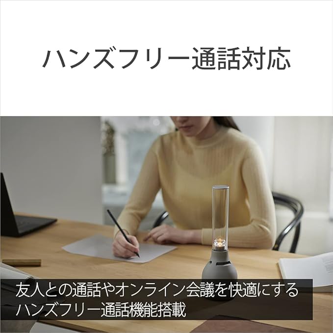 ・クリアな音が広がる独自のスピーカー構造 クリアなサウンドはそのままに、トゥイーター構造の改善とウーファー口径のサイズUP によりボーカルの明瞭さと低域を強化 ウーファーの口径サイズがUP、中音域の音質向上、ボーカルの厚み、明瞭度アップ 音の出し方の原理が弦楽器や打楽器と近いことで、 楽器の音の響きや、人の細かな息遣いまでもリアルに再現 ・幅広いBluetoothコーデックに対応 LDAC/AAC/SBCに対応 幅広い音楽試聴が可能 ・32段階の明るさから選べるライティング LEDの明るさは、32段階の明るさから部屋の雰囲気やお好みに合わせて調整が可能。 本体のタッチセンサーでもライティングのオン/オフの切り替えや輝度の調整が可能 キャンドルのように揺らぐ「キャンドルライト」モードも搭載。 LSPX-S2で好評だった「キャンドルライト」モードにバリエーションが増加。強中弱に加え、音楽連動も実現 ・ハンズフリー通話対応 友人との通話やオンライン会議時にも使用可能。 スピーカー本体の側面に通話ボタンを配置し、簡単にハンズフリー通話が楽しめる ・Music Centerアプリ連帯 音質変更、光の輝度設定、スリープタイマー、ライティングモード選択など アプリ連携で多彩な使い方