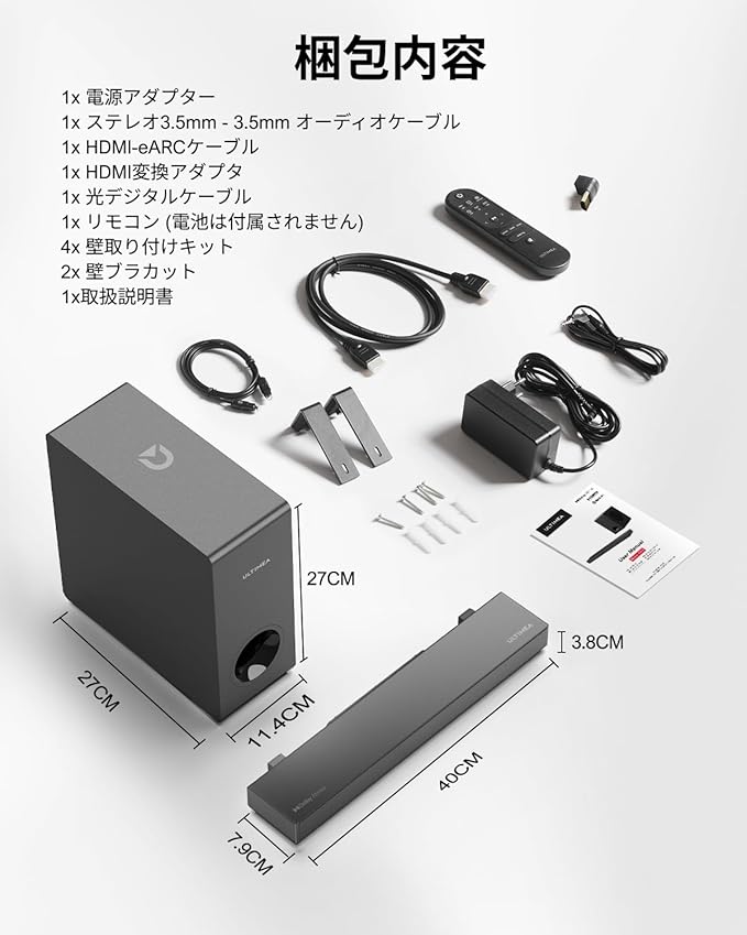 【梱包内容】:サウンドバー本体*1、サブウーファー(有線)***1、電源アダプター***1、各ケーブル、HDMI変換アダプター*1、リモコン*1(電池非付属)、日本語説明書、取付用アクセサリーとなります。本製品ドライブユニットの仕様:1.2"*3.8" x 2 (サウンドバー) + 5.25" (サブウーファー)となります。最大音圧レベル:>103dB、信号対雑音比:>87dB、歪み:<1%となります。本製品の推奨スペースサイズは25平方メートルです。
