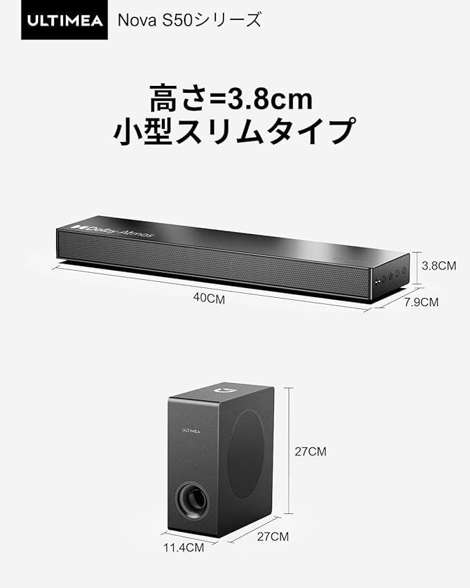 ULTIMEA サウンドバー Dolby Atmos テレビ スピーカー 2.1ch サブウーファー付き Soundbar ピーク電力190W 重低音強化型 HDMI eARC/AUX/光デジタル/Bluetooth5.3対応 ホームシアターPC/TV スピーカー 小型 コンパクトサウンドバー Nova S50