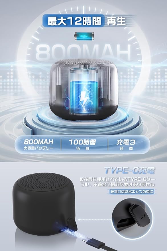 【IPX7防水・優秀な互換性】IPX7レベルの防水 スピーカーとして、お風呂、キッチンだけでなくアウトドアでも安心して使えます。全密閉構造しかも防水キャップ付きなので、アウトドアやお風呂スピーカーとしては最適です。優れた交換性はiOS、Android、Windows、スマホ、タブレット、PC、switch、Bluetooth機能搭載の各種デバイスが対応できます。機器と一度ペアリングしておけば、2回目からのBluetooth自動ペアリングになります。
