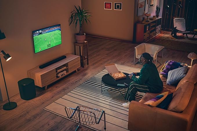 10基のスピーカーを搭載しさらに進化したドルビーアトモスサウンドバーシステム、新たに4種類の「サウンドスケープ」再生に対応、「海の音」や「雨の音」など自然の音を部屋中に満たし癒し空間の演出が可能