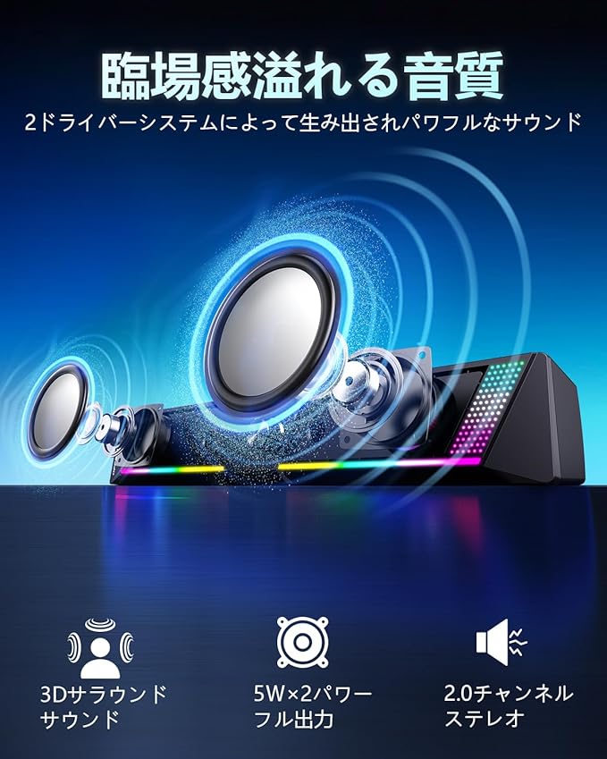 【パワフルでクリアなサウンド】 PCスピーカーはφ50mm*2丸型フルレンジスピーカーユニットを採用し、最大5W 2デュアルドライバー出力、クローズドキャビティデザインで、音の歪みを最小限に抑え、曲の細部まで忠実に再現します。バランスの良い音と厚みのあるサウンドをお楽しみいただけます。