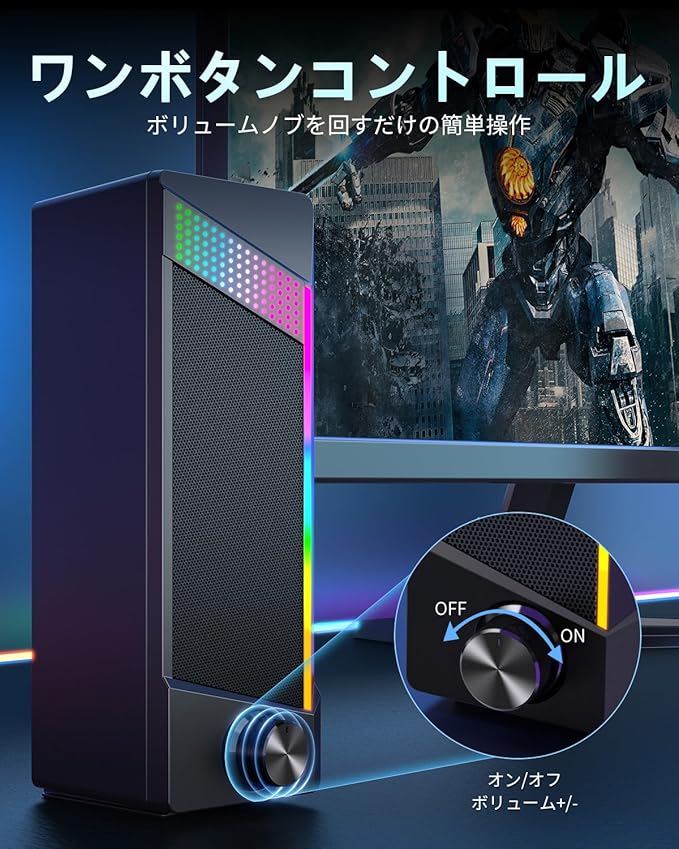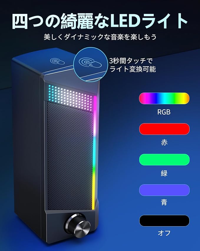 【RGBダイナミック照明効果】素敵なカラフルな呼吸サイクルRGBライトを備えており、ゲームをしたり、映画を見たり、音楽を聴いたりする時に雰囲気を高めます。スピーカー本体はクラシックでミステリアスなブラックトーンを採用し、RGBライトで飾られ、全体の形はとてもクールで、PCゲームに最適です。
