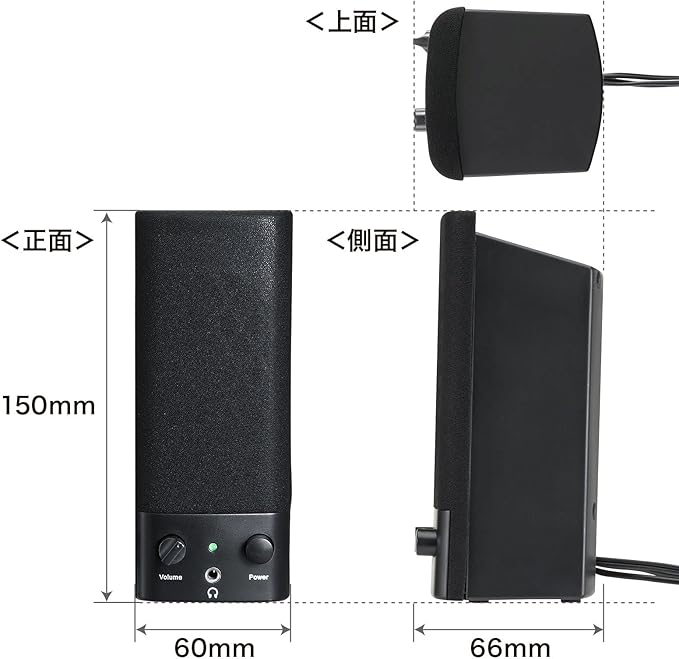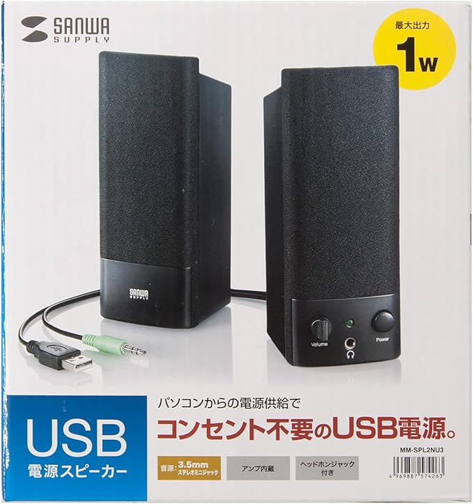 ●実用最大出力1W(0.5W+0.5W)のマルチメディアスピーカーです。●アンプ内蔵でヘッドホンステレオの出力端子やパソコンの音声端子につなぐだけで音楽を楽しめます。●USBポートから電源を供給するのでコンセント周りが煩雑になりません。●ボリュームコントロールとパワーON・OFFスイッチが分かれているのでスイッチを入れれば いつもの音量ですぐに音楽を楽しめます。 ●深夜や周りに気を使う環境にも便利なヘッドホン端子を内蔵しています。■カラー:ブラック■実用最大出力:1W(0.5W+0.5W)■周波数特性:200~20000Hz■スピーカー形式:バスレフ型フルレンジスピーカーシステム■スピーカーサイズ:2 3.5インチ(直径50 88mm)■ロードインピーダンス:4Ω■入力端子:ステレオミニプラグ(3.5mm)■外部出力:ヘッドホン端子■電源:内蔵※USBポートより供給(DC5V/500mA)■サイズ:W60 D66 H150mm■重量:396g■ケーブル長:パソコン接続ケーブル/約1.0m、スピーカー間ケーブル/約0.9m、USB電源ケーブル/約1.0m■セット内容:本体、取扱説明書