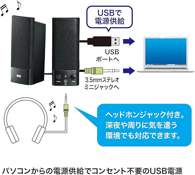 アンプ内蔵でヘッドホンステレオの出力端子やパソコンの音声端子につなぐだけで音楽を楽しめます。