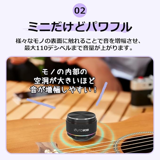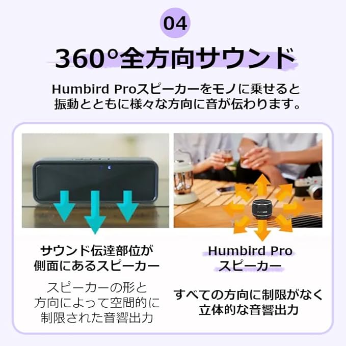 「Humbird Proスピーカー」は、モノの表面で振動しながら音を増幅させてスピーカー効果を発揮します。周辺のモノをスピーカーユニットに変えてくれる「Humbird Proスピーカー」で様々な音の変化を感じてみてください!