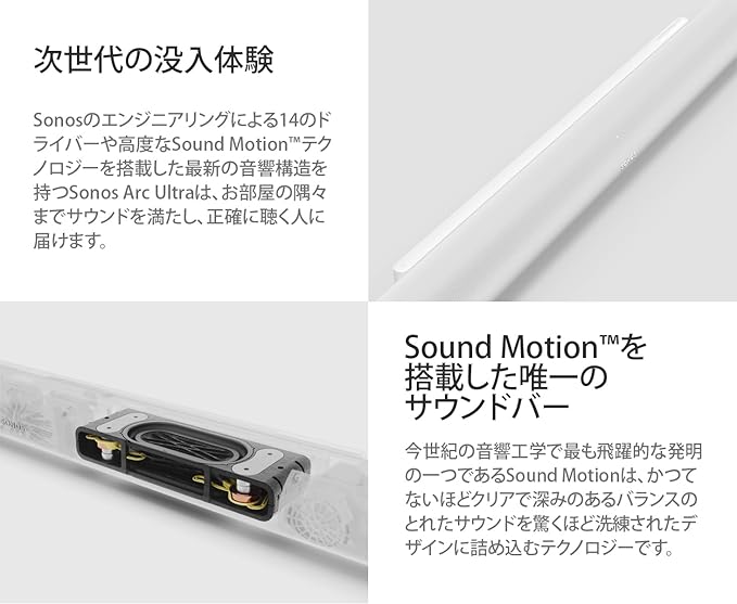 Sonos Arc Ultraは、他のサウンドバーでは不可能な臨場感あふれるエンターテインメントを実現します。洗練されたデザインを可能にした画期的なSound Motion™テクノロジーを採用。これまでにないほどクリアで深みがあり、バランスの取れたサウンドで聴く人をあらゆる方向から包み込みます。