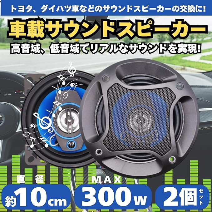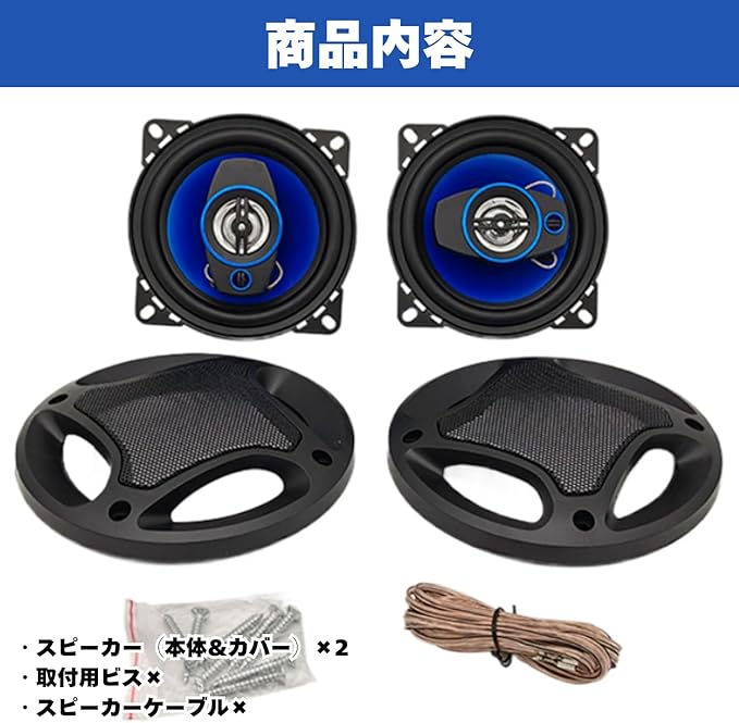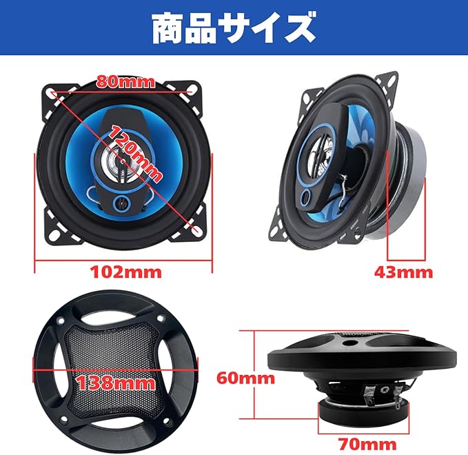 【商品内容・商品サイズ】 サイズ:(約)13.8 6cm、内側直径10.2cm 重さ:(約)428g 公称インピーダンス:4Ω 最大ミュージックパワー:300w 定格電力:30w 商品内容:スピーカー(本体&カバー) 2、取り付け用ビス 8、スピーカーケーブル 2