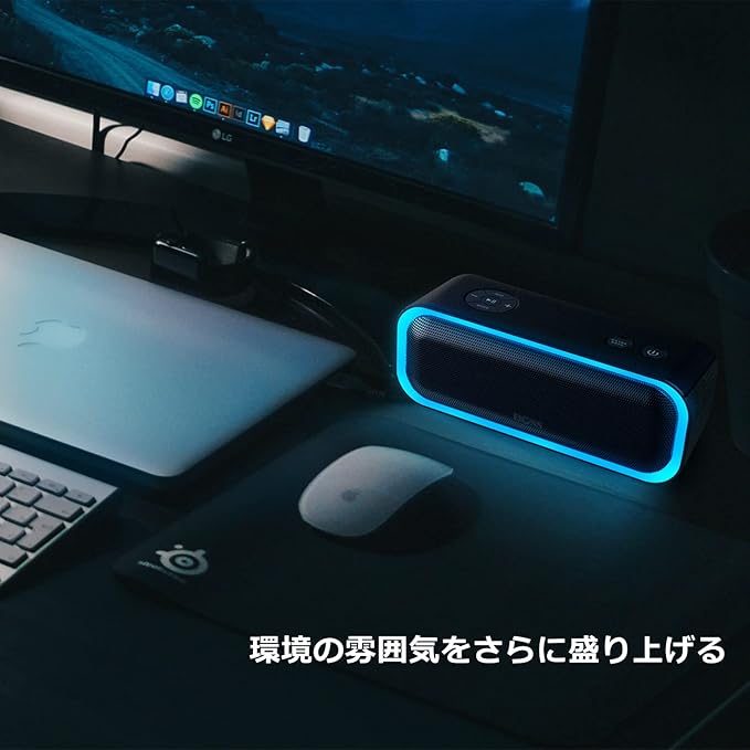 【ライティング機能・持ち運び便利】このポータブルスピーカーには、赤、青、緑、水色、黄色、紫の6色のLEDライトが搭載され、音楽のリズムに合わせて自動的に色が切り替わり、点灯します。家族や友達と一緒にバーベキューやキャンプ、パーティー、ダンスを楽しむ際には、音楽とライトショーが雰囲気をさらに盛り上げます。(「EXTRA BASS」ボタンを長押しすると、スピーカーのLEDが消えます。)Bluetoothスピーカーの前面を除いた部分には滑り止めのシリコン素材が使用され、背面パネルには多くの小さな穴が配置されています。これにより、スピーカーを持った状態での落下を防ぎ、大音量の出力も確保されます。コンパクトなサイズの小型スピーカーであり、片手で握りながら持ち歩くことが可能です。自由にバッグに入れてどこへでも持ち運び、音楽を楽しむことができます。