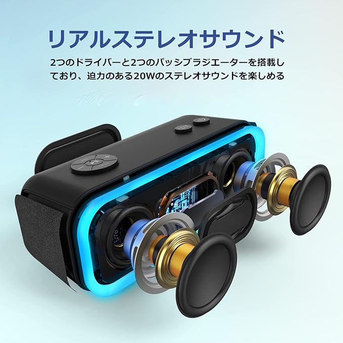 DOSS SoundBox Pro Bluetooth スピーカー20W 強化された低音 ワイヤレス ポータブル 小型 ブルートゥース スピーカー【イルミネーション機能 20時間再生 IPX6防水 パッシブラジエーター搭載 ワイヤレスステレオ Aux/TFカード対応/風呂/アオトドア適用】(ブラック)