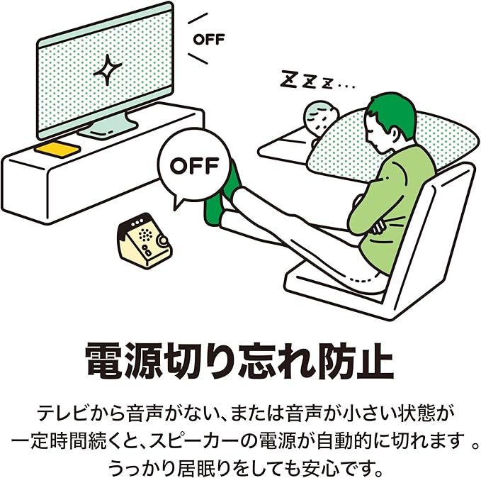【 自動電源オフ機能 】テレビから音声がない、または音声が小さい状態が一定時間続くと、スピーカーの電源が自動的に切れます。