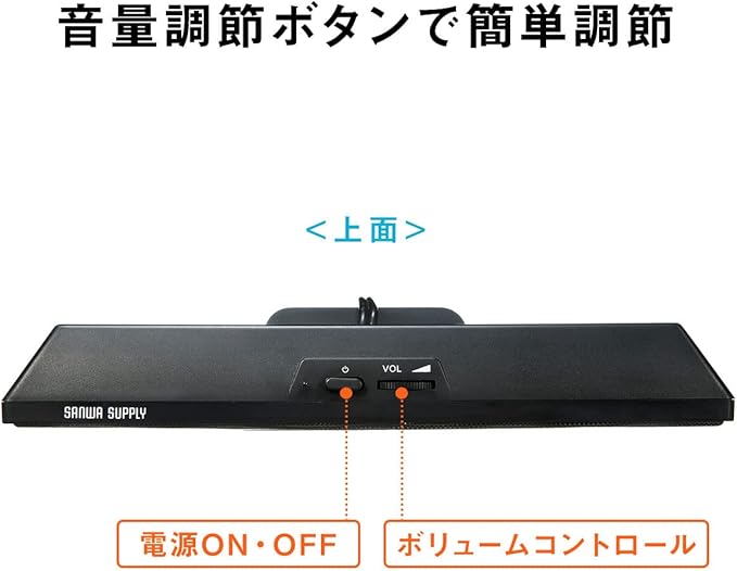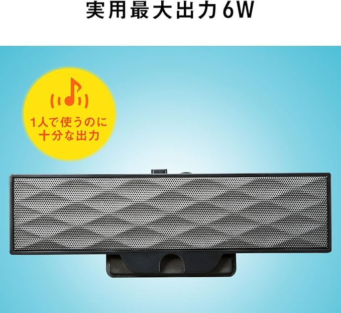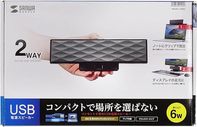 ●ノートパソコンやタブレットの画面上部に固定でき、USBケーブルで電源供給できるUSB電源方式のサウンドバースピーカーです。●様々な厚みのノートパソコンに装着できるクリップ付き、最大25mm幅まで装着可能です。●電源をUSBポートから供給するUSB給電方式のスピーカーです。AC電源を必要としないので接続が綺麗にでき、簡単に設置できます。●製品単体でも自立するため、ノートパソコンの横やデスクトップパソコンでのディスプレイ下などレイアウトは自由にできます。●音源出力は3.5mmステレオミニジャック接続でパソコンの音声端子につなぐだけで音楽を楽しめます。●ボリュームコントロールとパワーON・OFFスイッチが分かれているので、スイッチを入れればいつもの音量ですぐに音楽を楽しめます。●実用最大出力6W(3W+3W)でコンパクトなサイズながら迫力のある高音質を再生します。■カラー:ブラック■実用最大出力:6W(3W+3W)■周波数特性:80~18000Hz■スピーカー形式:密閉型フルレンジスピーカーシステム■スピーカーサイズ:40mm 40mm■インピーダンス:4Ω ■入力端子:ステレオミニプラグ(3.5mm)■電源:USBポートより供給(DC5V 500mA)■サイズ:W205 D35 H68mm(スピーカー本体)■重量:約290g(スピーカー本体のみ) ■ケーブル長:PC接続ケーブル/約1.2mUSB電源ケーブル/約1.2m■筐体材質:ABS樹脂■付属品:取扱説明書・保証書