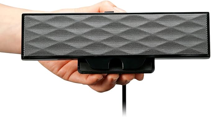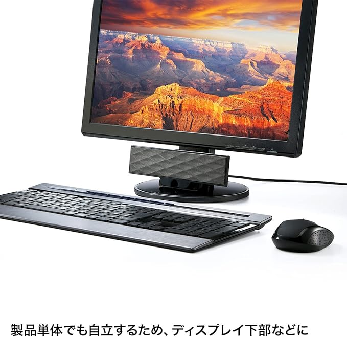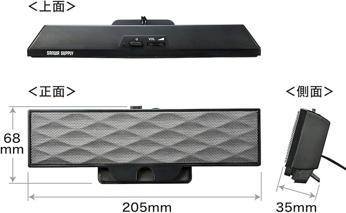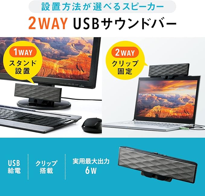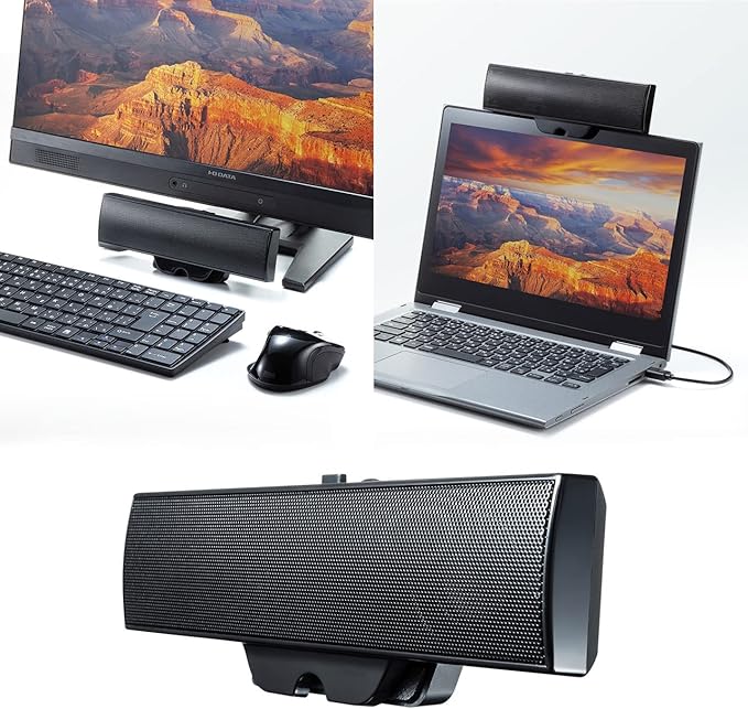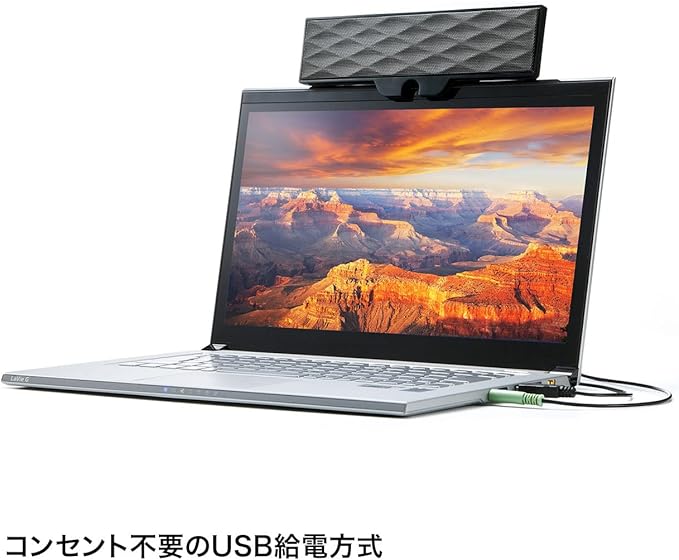 ノートパソコンやタブレットの画面上部に固定でき、USBケーブルで電源供給できるUSB電源方式のサウンドバースピーカーです。
