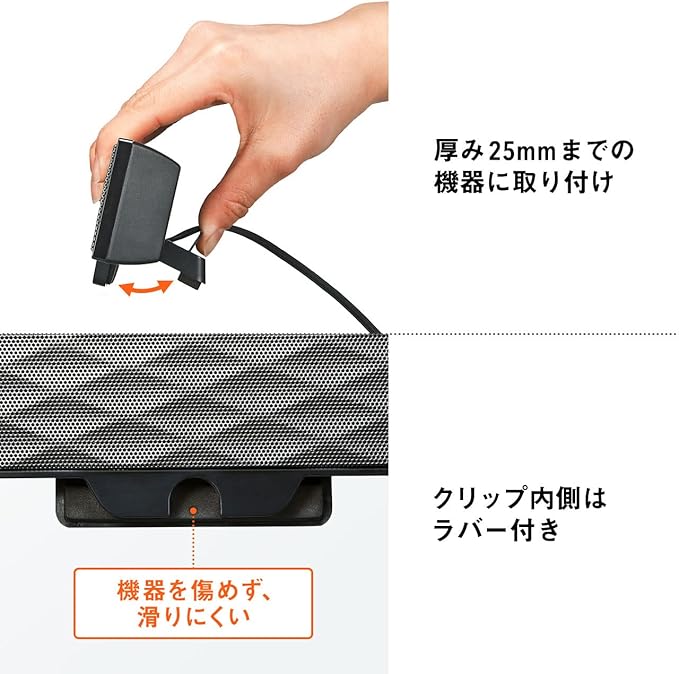 様々な厚みのノートパソコンに装着できるクリップ付き、最大25mm幅まで装着可能です。