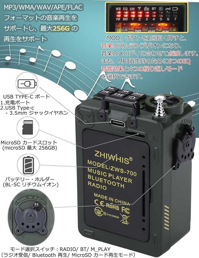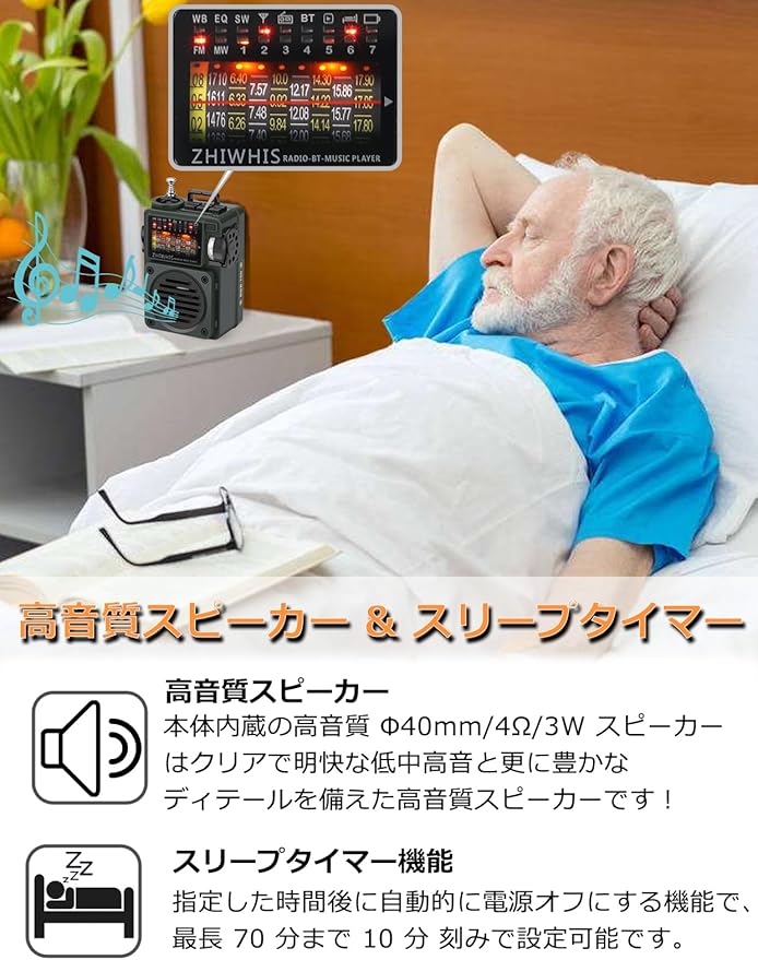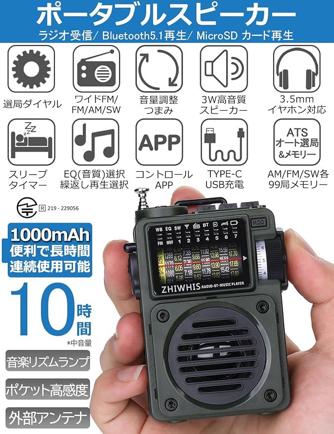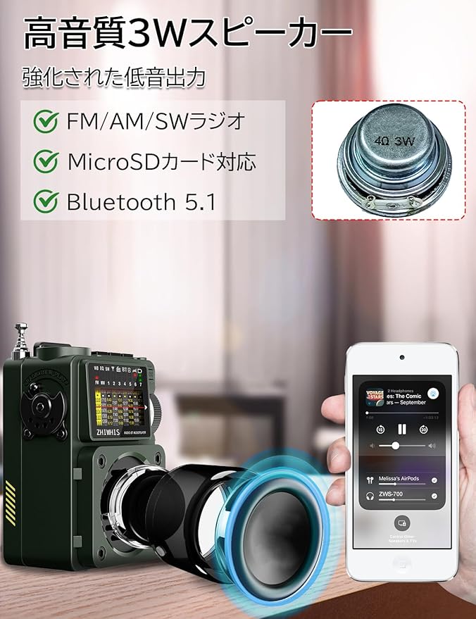 ZHIWHIS Bluetoothスピーカー BCLラジオ MP3プレーヤー AM/FM/短波/ワイドFM対応 APPコントロール/イヤホン対応/重低音/MicroSDカード対応/タイマー/充電式/10時間連続再生 小型 軽量 コンパクト アウトドア 新登場ZWS-700