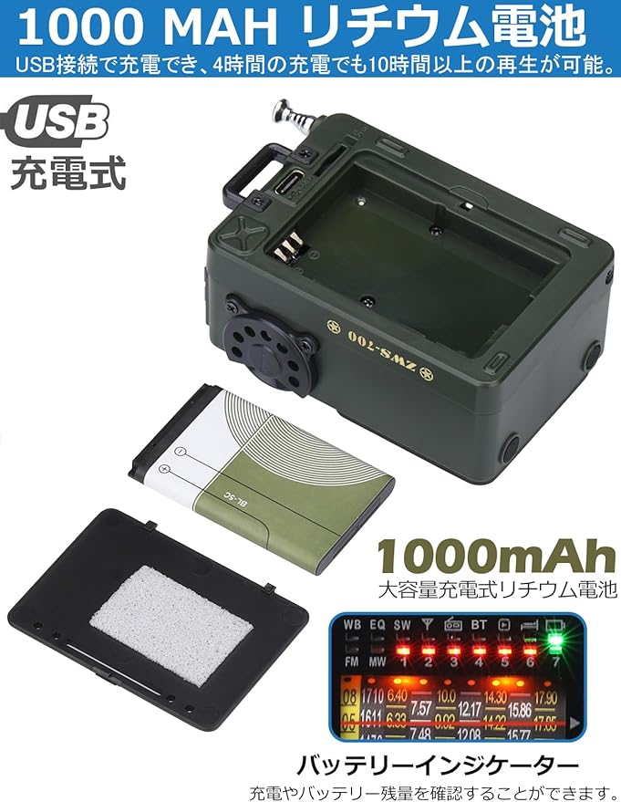 「USB-Cポート採用」この防災ラジオは交換可能な1000mAHリチウム電池を使用しています。付属のUSB-Cケーブルにより約4時間で満充電となり、標準的使用の場合は約10時間使用することができます