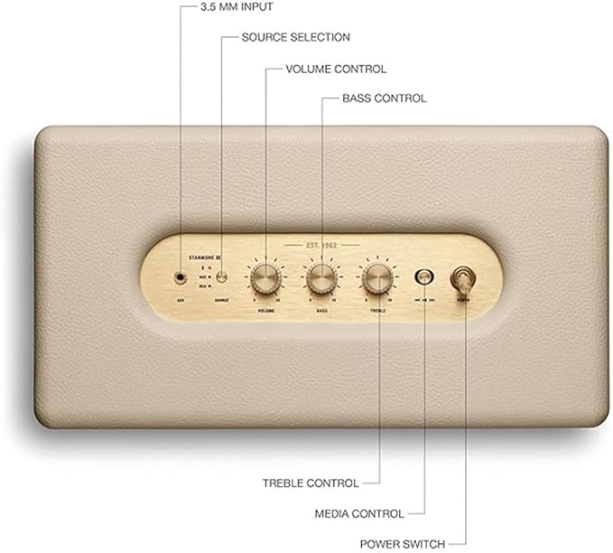 【際立ったアイコニックデザイン】Stanmore IIIはMarshallの特徴的なロックンロールホームスピーカーのコンセプトを踏襲しつつ、ロゴプレート、真鍮のコントロールノブなどブランドアイデンティティを洗練されたデザインで表現しています。スピーカーの前面を飾る真鍮のパネルはより細く、流線型になり、フレットは全体的な仕上げに合わせてカラーコーディネートされています。マルチディレクショナルコントロールノブとクラシックなパワースイッチはスピーカー本体を演出し、マーシャルアンプのレガシーを彷彿させます。