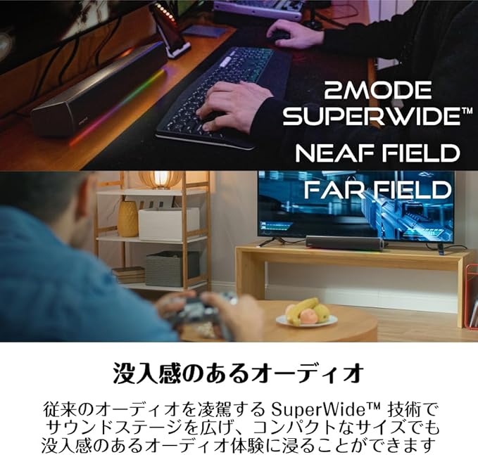 2モードのSuperWide機能を備えており、オーディオのサウンドステージを広げ没入感のあるゲーミング オーディオ体験に浸ることができます。デスクトップで使用するためのニア フィールドと、リビング ルームなどで使用するためのファー フィールドのモードがあり、自分のゲーミングステーションでワイドなサウンド ステージでゲームを楽しんだり、リビングで映画を楽しんだりできます