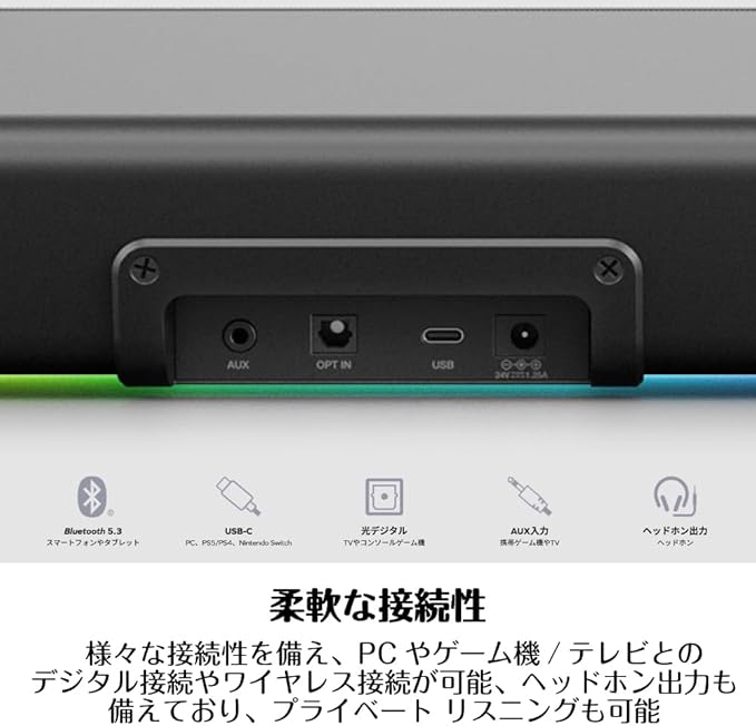 30W RMS/ピーク出力60Wの高音質USBデジタル オーディオの再生が可能で、パワフルな楕円状ドライバーと背面の内蔵バスチューブによって、深みのある低音の効いた迫力サウンドを再生。ゲーミング モニターやテレビの下にフィットするようデザインされたスリムなボディの下側にはRGB ライティングを備えており、ゲーミング シーンをイルミネーションで彩ります