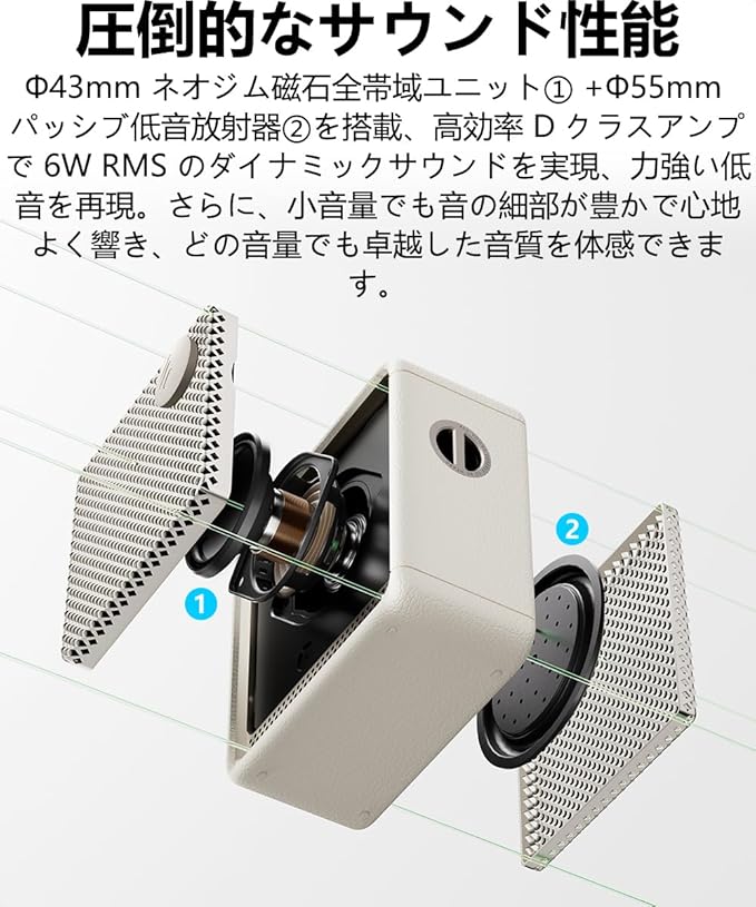 【圧倒的なサウンド性能】Φ43mm ネオジム磁石全帯域ユニット +Φ55mm パッシブ低音放射器を搭載、高効率 D クラスアンプで 6W RMS のダイナミックサウンドを実現、力強い低音を再現。さらに、小音量でも音の細部が豊かで心地よく響き、どの音量でも卓越した音質を体感できます。