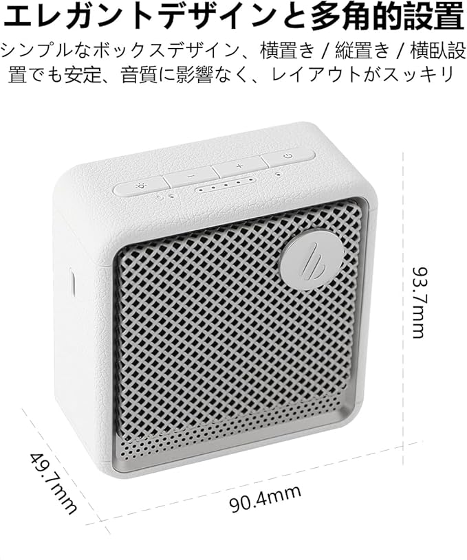 【エレガントデザインと多角的設置】シンプルなボックスデザイン(寸法 49.7奥行き x 90.4幅 x 93.7高さ mm、重量 326g)、横置き / 縦置き / 横臥設置でも安定、音質に影響なく、レイアウトがスッキリ。