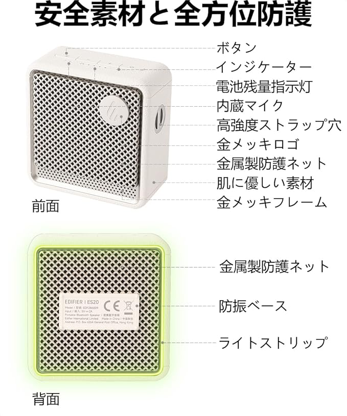 Edifier ES20 Bluetooth スピーカー|全新 ES シリーズ ポータブルスピーカー|ステレオペアリング対応|15 時間連続再生|IP67 防水防塵(お風呂使用可)|内蔵マイク・クリア通話|USB-C|4 種類のサウンドモード(音楽/ゲーム/映画/屋外)|アンビエントライト|アプリ対応|アイボリーホワイト