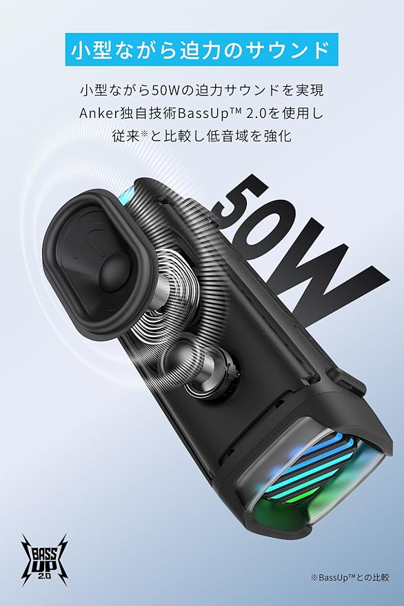 小型ながら迫力のサウンド : 小型ながら50Wの迫力サウンドを実現。Anker独自技術BassUpTM 2.0を使用し、従来 (※) と比較し低音域を強化。※BassUpTMとの比較