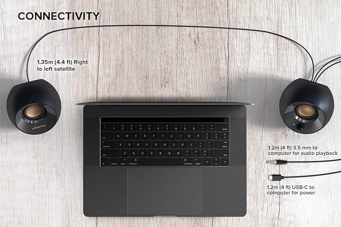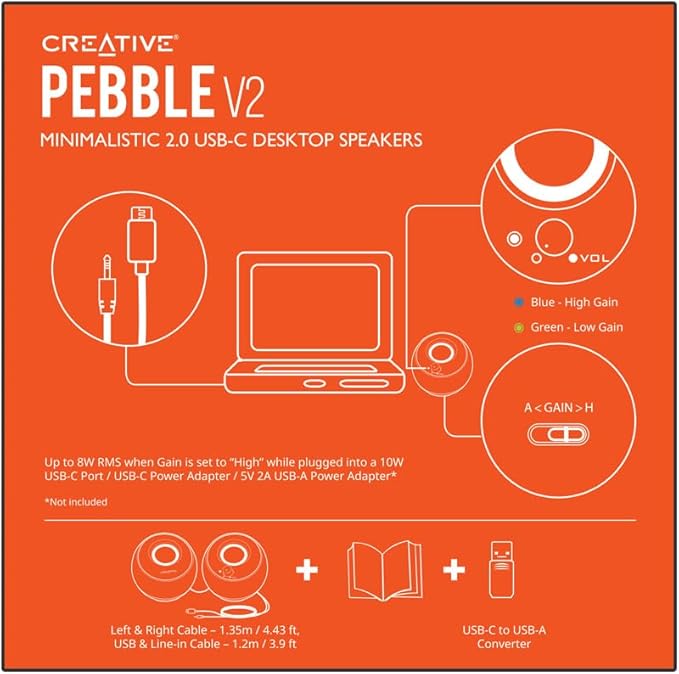 最新のUSB-C接続とAUX-IN | Creative Pebble、Pebble V2からのアップグレードは、将来的に使えるようになり、新しいコンピューターで使用されているUSB-Cを搭載しています。 USB-C接続により、スピーカーがより多くの電力を消費し、歪みなく高音量で音質を向上させることができます。 オーディオ再生用のユニバーサル3.5mm AUX-INと電源用のUSB-Cの両方を介してデバイスを接続するだけです。 古いコンピューターでPebble V2を使用できるUSB-C - USB-Aコンバーターが含まれています。