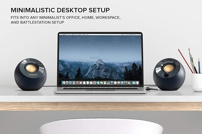 ミニマリストのデスクトップに最適 | クリーンでモダンな外観を念頭に置いて設計されたPebble V2は、Creative Pebbleと同じフォームファクターに従い、ミニマリストのオフィス、自宅、ワークスペース、バトルステーションのセットアップに適合します。 右から左のサテライトスピーカーを接続する長いケーブルと、ボリュームコントロールに簡単にアクセスできる同じ前面ノブを備えたPebble V2は、あらゆるデスクトップに完璧にフィットします。