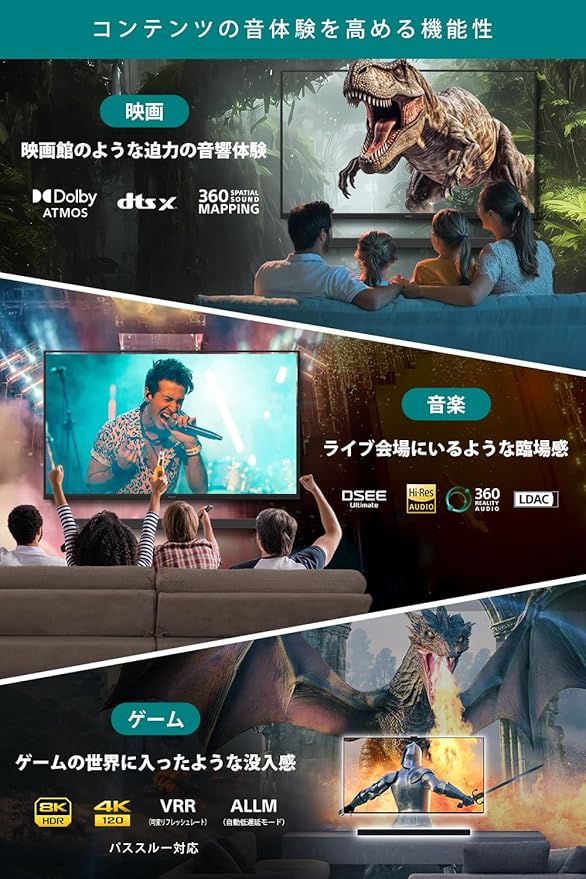 【映画館のような迫力】▼ソニー独自の360立体音響技術で広大な音場を生成▼新開発のスピーカー構成で音の明瞭感とサラウンド感も進化▼TV番組やネット動画音源も立体音響化が可能