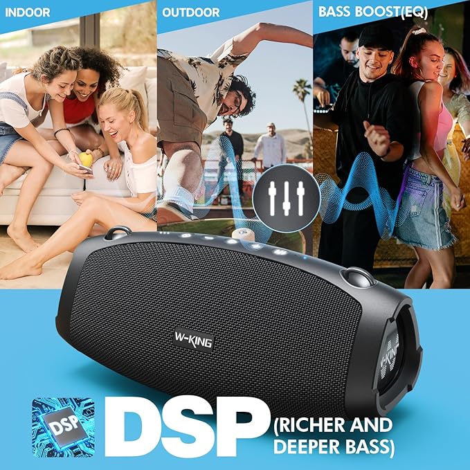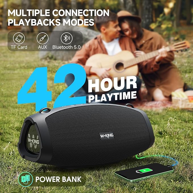 120W MAX 70W RMS スピーカー bluetooth 重低音、IPX6防水防塵ワイヤレス スピーカー 大音量、W-KING ポータブルワイヤレスアウトドアスピーカー、42時間連続再生、通話対応でアウトドアにも、パワーバンク、DSP、強化された低音(イコライザー)、、対応 sdカード TFカード/AUX 接続 入力対応、ホーム、キャンプ用