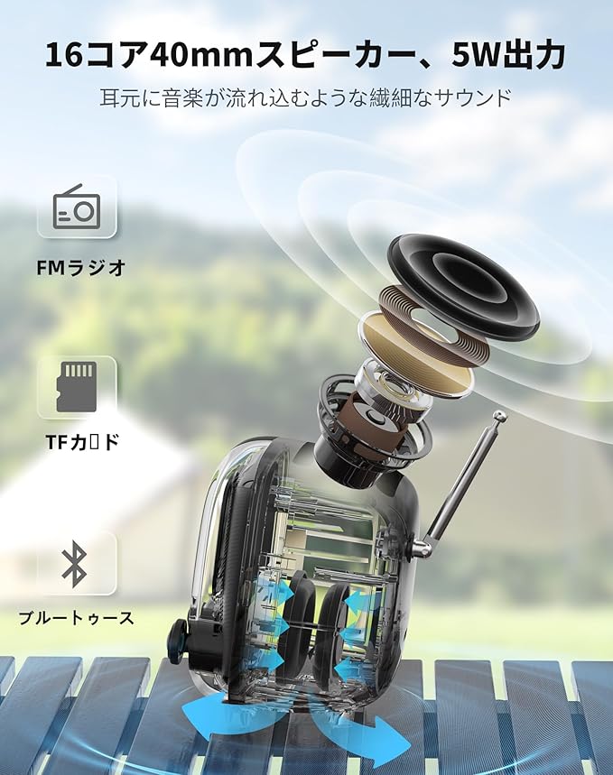 【製品仕様】① 外形サイズ: 73.92 74.1 96.62mm (※アンテナ除く) / 重量: 288.6g② 電池: 2000mAh / 駆動時間: 約8時間 (※音量及び再生内容により変動) / 充電時間: 約4時間 (5V1A) / 出力: 5W③ Bluetooth: バージョン5.3 (10m以内)④ スピーカー: 40.5mm⑤ 対応再生モード: Bluetooth・マイクロSDカード・FMラジオ・PC接続⑥ OTAアップデート対応: アプリ経由で最新のファームウェア版を更新可能。