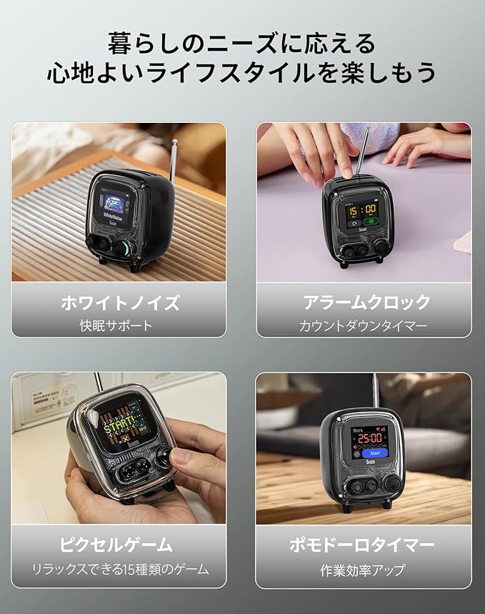 【小型スピーカーの常識を超えろ、Tiivoo-2登場】コンパクトながらハイレゾ対応の高音質マルチメディアスピーカー、新型Tiivoo2。デスクや生活に寄り添い、音楽やあらゆるシーンを豊かに彩ります。小さな筐体に驚異的な性能を凝縮:①5W出力&デュアルダイアフラムで、豊かで歪みの少ない低音を実現。②24bit DSPアルゴリズムと自動音場補正が、ジャンルに最適な音響を自動選択。③Bluetooth 5.3と360 全方向サラウンドで、高忠実伝送と均一音場が没入感を生む。「小型だから音質は諦める」という固定観念を打ち破ります。1~16段階の細やかな音量調節で、集合住宅や夜間も周囲を気にせず使用可能。音楽を聴かない時は、おしゃれなデスククロックやビジュアライザーとしても機能し、よりパーソナルなデスク空間を実現します。