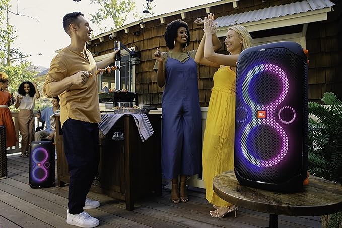 ボディの正面に配置されたウーファーの外周をリング状のライトが囲み、華やかに光るライトショー機能を搭載。本モデルでは、ツイーターの外周も光るようになり、前モデルよりも発光面が拡大したことにより、さらにパワフルになったライティングが、音楽と共に場の雰囲気を盛り上げます。