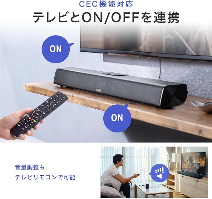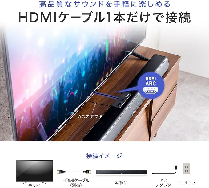 最大出力70Wの高出力/ 高音質 な サウンドバースピーカー です。HDMI/ARC対応でテレビ放送をサウンドバースピーカーから再生したりテレビの電源ON/OFFと サウンド バー の電源を連動させることが可能です。