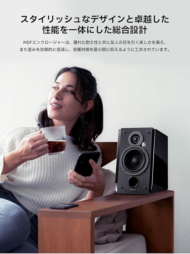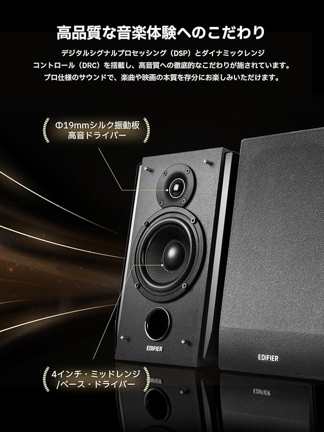 【大音量・高音質】Edifier R1850DB アクティブスピーカーは DSPとDRCを搭載し、高音質への徹底的なこだわり。4つのパワフルなドライバーユニットを搭載し、合計70W(RMS)の高出力に対応。部屋中に広がる迫力あるサウンドで、まるでライブ会場にいるかのような臨場感を演出。